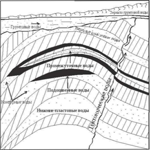 При разработке месторождений извлекаемая нефть помимо углеводородов всегда содержит в своем составе воду. Часть этой воды имеет естественное происхождение, и связано с перетеканием подземных вод из сообщающихся пластов вследствие особенностей геологического строения месторождений углеводородов. Подземные воды, непосредственно сообщающиеся с нефтегазоносными пластами, разделяют на типы по их совместному положению в пространстве:
