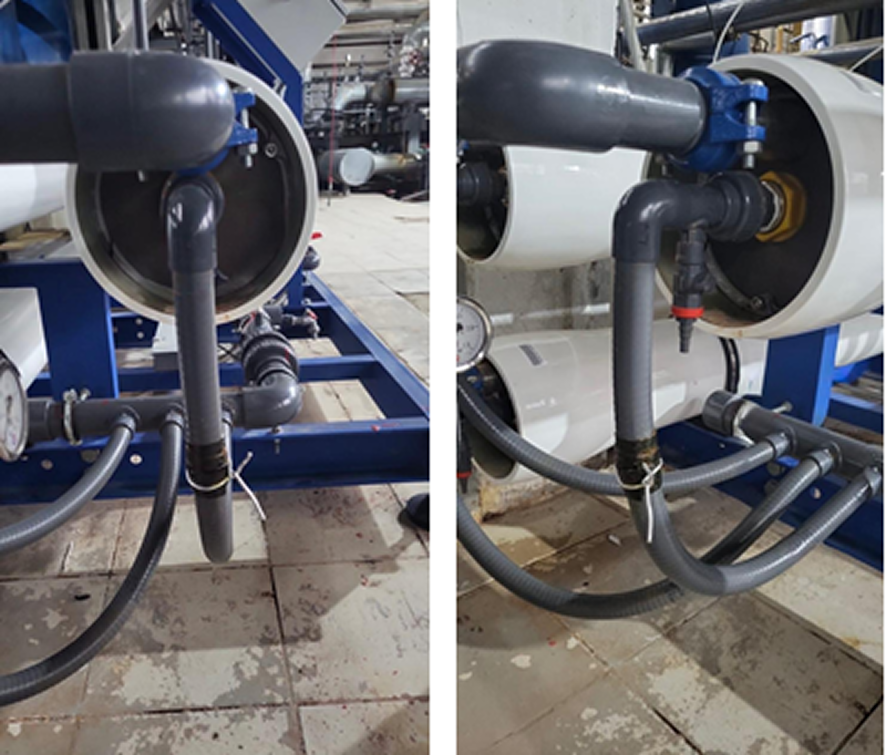 Также произведена замена гибкой трубы по линии пермеата. Новая гибкая труба установлен с соблюдением технических требований и норм эксплуатации, выполнена проверка соединений на герметичность и устойчивость к рабочему давлению.